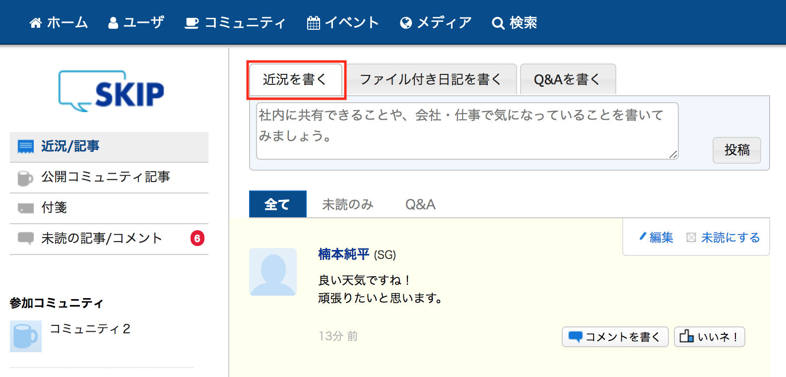 実は、近況と記事に大きな差はありません。具体的には、表示される場所(ホーム画面中央)も、公開範囲も同じです。SKIPが想定している利用シーンとしては以下のようになります。 - 近況